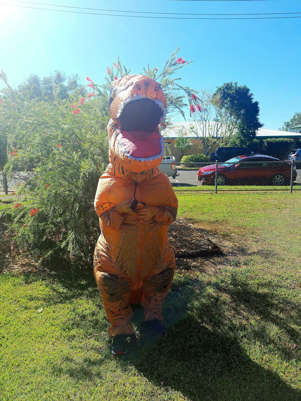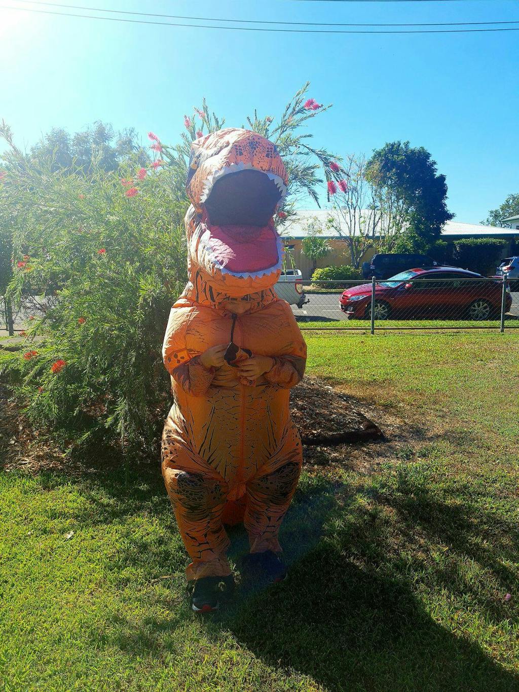 - A full-body inflatable jumpsuit made from durable plastic, featuring a rear zipper and a clear vinyl viewing port located in the dinosaur's neck, ensuring your child can see clearly while in character.
